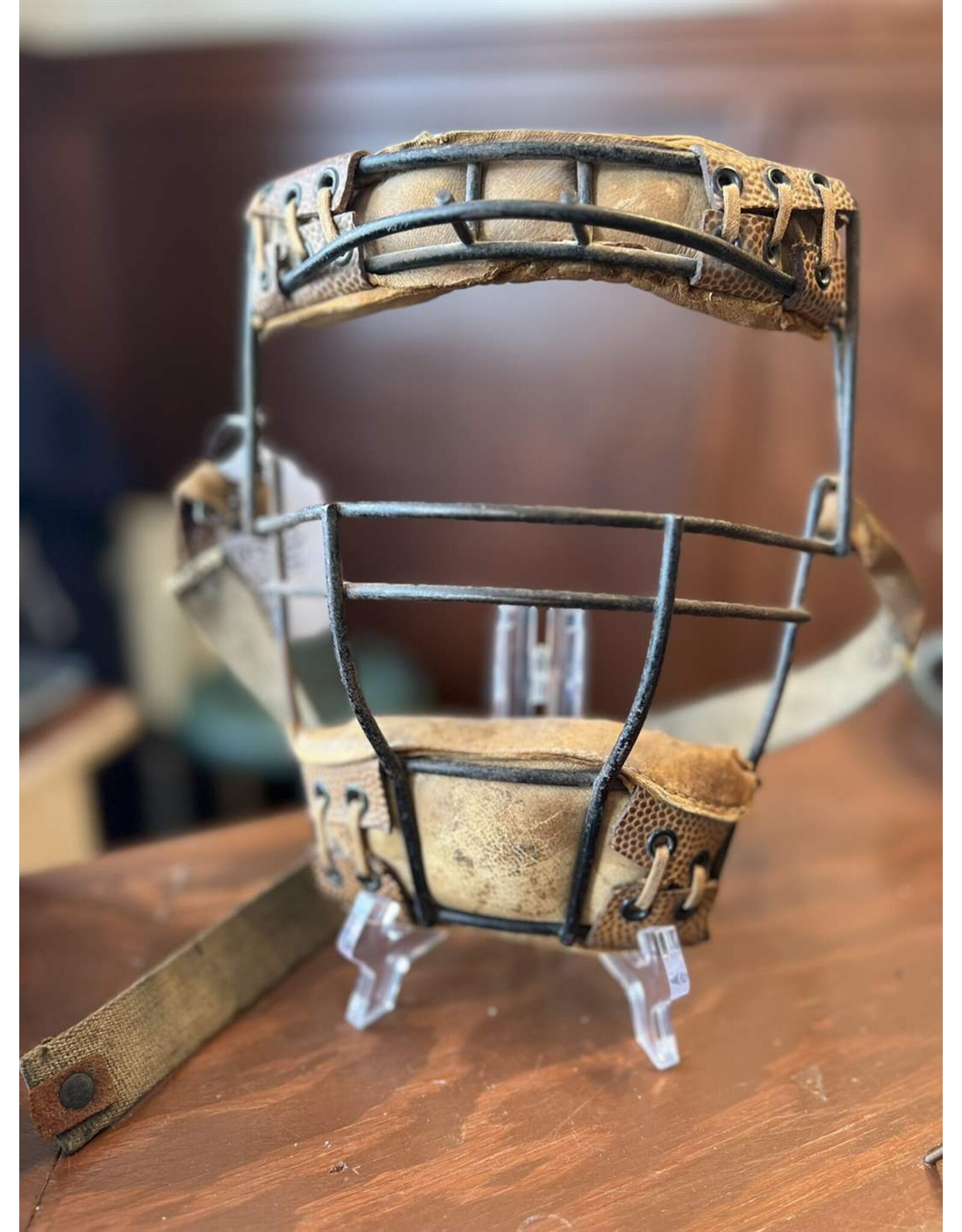 Antique leather Wilson's Sports Equipment baseball catcher's mask in good condition. Leather has a wonderful patina with an interesting basketball-type texture on some sections, known as pebbled cowhide. Top strap looks like it is missing a piece.